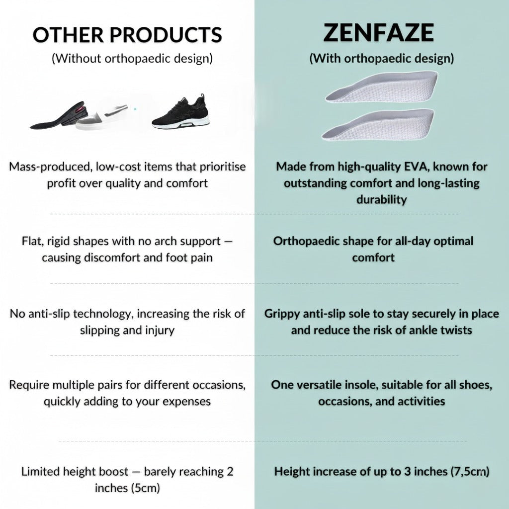 With Zenfaze, you get up to +1.5 inches of height—all thanks to our discreet lift system that no one will notice. Premium cushioning and an ergonomic fit keep you comfortable all day, so you walk taller without your feet ever getting tired.